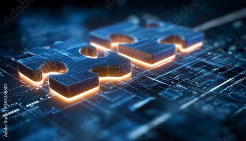 Digital Puzzle Connection Puzzle Pieces with Glowing Edges on a Futuristic Circuit Board