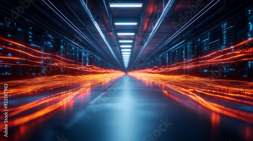 Digital Tunnel of Light: A mesmerizing digital corridor with glowing red and blue lights, creating an abstract and futuristic scene. This captivating image invites viewers to explore the endless possi