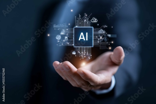 Digital Visualization of Artificial Intelligence Integration with Human Control, Depicting Central AI Chip Hovering Above Hand Surrounded by Smart Tech Icons in Futuristic Blue Interface