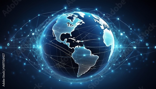 digital world connection globe with network lines on dark blue background representing global communications