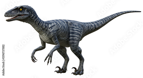 Digitally rendered illustration of a standing striped raptor with yellow eyes
