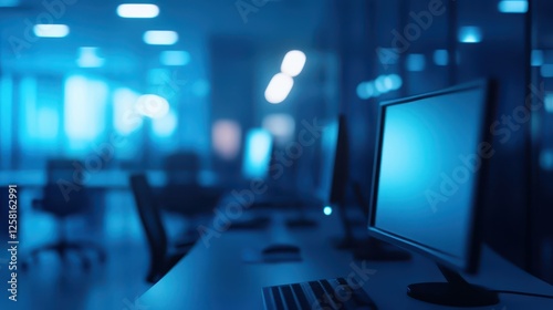 dim, office, interior, blurred, object, defocused, lighting, workspace, technology, desk, computer, modern, corporate, environment, shadow, furniture, design, ambience, monitor, keyboard, equipment, wall, layout, glasses, space, contemporary, quiet, glow, minimalistic, empty, soft, illumination, blue, atmosphere, professional, arrangement, architecture, detail
