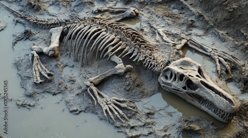 dinosaur, fossil, skeleton, mud, prehistoric, staying, natural, excavation, ancient, bone, artifact, unearth, vertebrate, jurassic, partially, animal, record, evolution, layer, cretaceous, deposit, immersed, surround, specimen, study, stratum, depict, context, relic, structure, formation, creature, evidence, geology, scientist, remnant