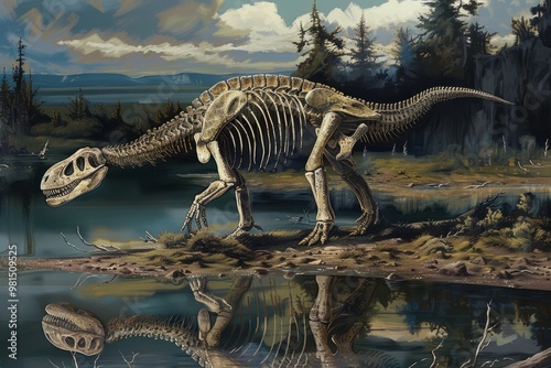 Dinosaur fossil skeleton near a reflective lake in a forest landscape with mountains in the background. 3D dinosaur skeleton.