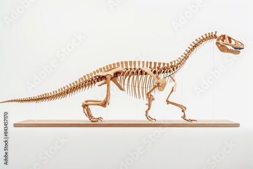 dinosaur, skeleton, exhibit, museum, paleontology, prehistoric, extinct, bone, fossil, science, biology, natural history, evolution, display, research, animal, creature, reptile, anatomy, structure, white, background, wooden, platform, mounted, standing, walking, long, neck, tail, delicate, visible, intricate