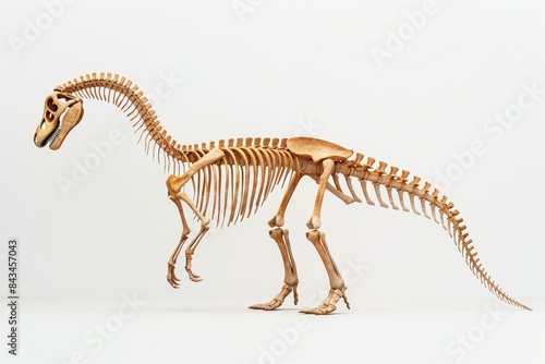 dinosaur, skeleton, bone, prehistoric, fossil, paleontology, museum, exhibit, anatomy, extinct, animal, vertebrate, science, research, biology, evolution, natural history, display, studio, white background, zoology, long neck, posed, full body