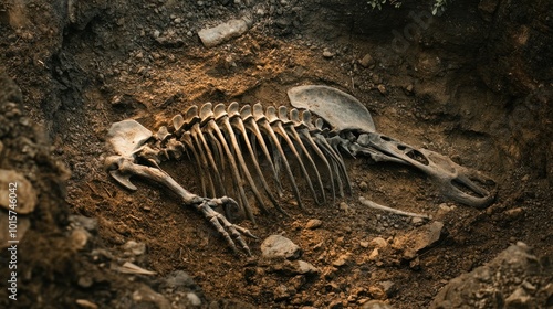 Dinosaur skeleton under soil: An excavation site where prehistoric bones are slowly being revealed from beneath the ground