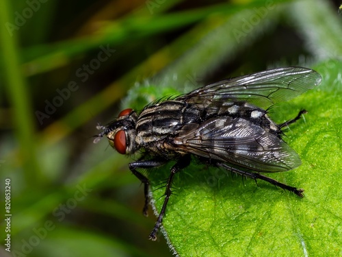 Diptera Meat Fly Insect On a leaf. Flesh fly (Sarcophaga) Housefly called Mosca-Doméstica-Menor (scientific name Musca domestica)