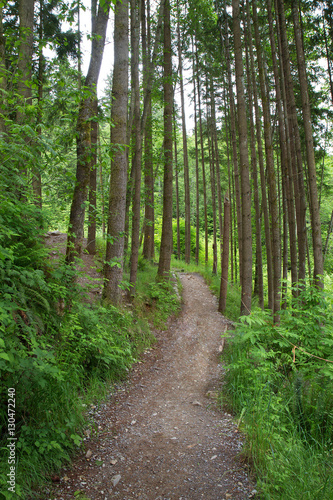 Dirt path going through a tree-filled forest