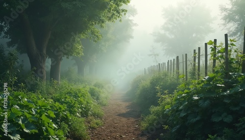 Dirt path in foggy garden with green plants and trees. Pathway through lush vegetation, fence on right. Misty morning in rural garden with overgrown greenery.
