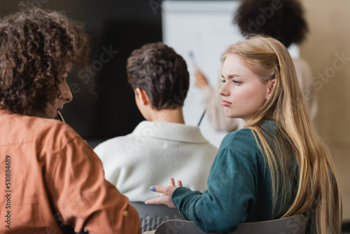 discouraged woman talking to classmate in university classroom.