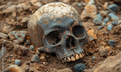 skull, ancient, discovery, excavation, earth, river bank, sunlight, pebble, bone, history, artifact, remain, buried, exploration, anthropology, science, research, landscape, historical, natural light, weathered, haunting, nature, relic