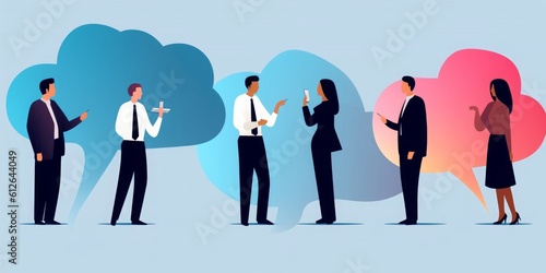 Discussion. Communication concept. Business people talking standing in the speech bubbles. illustration, Generative AI