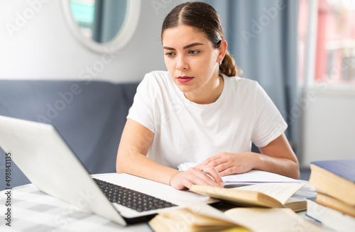Distance learning concept. Young woman using laptop studying
