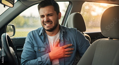Distressed Man Experiencing Chest Pain While Driving In Car Wearing Denim Shirt With Red Accent on Chest and Window Light