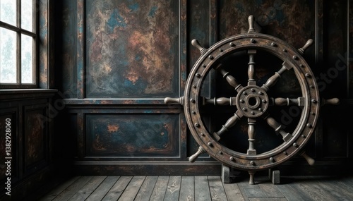 Distressed vintage wooden ship wheel in a moody monochrome setting, sailor, gray
