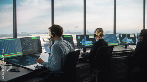 Diverse Air Traffic Control Team Working in a Modern Airport Tower. Office Room is Full of Desktop Computer Displays with Navigation Screens, Airplane Flight Radar Data for Controllers.