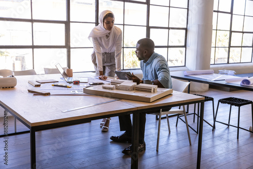 Diverse architects collaborating near scale model in design studio with laptop tablet blueprints