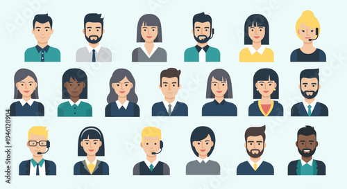 avatar, icon, people, man, woman, male, female, head shot, bust, face, character, person, human, professional, employee, staff, team, group, diverse, diversity, user, client, client, support, service, call center, headset, business, corporate, office, men at work, manager, adviser, sale, help desk, communication, technology, web, app, interface, profile, portrait, illustration, vector, graphic, collection, set, modern