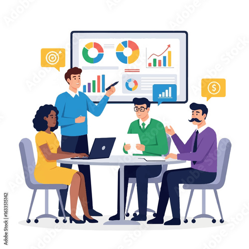 business, team, meeting, presentation, datum, analysis, collaboration, teamwork, strategy, planning, growth, success, finance, marketing, sale, statistic, chart, graph, diagram, progress, target, goal, objective, solution, development, management, communication, consulting, training, workshop, seminar, conference, startup, project, idea, innovation, office, workplace, professional, colleague, employee, diverse, man, woman, men at work, corporate, illustration, vector