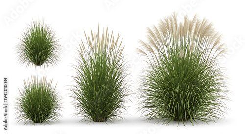 Diverse clumps of ornamental grasses including pampas with feathery plumes isolated on white background