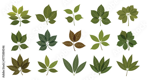 Diverse collection of vector illustrated compound leaves in various shades of green and brown, isolated on a white background.