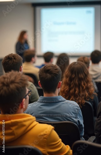 Diverse college students attentively listen to presentation. Students sit in classroom setting. Speaker stands at front. Group of people listen. Classroom atmosphere. Focus on student engagement.