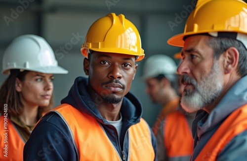 Diverse construction workers wear safety helmets and vests. Team collaborates on site, building project, ensuring workplace safety and health standards. Skilled labor force on job.
