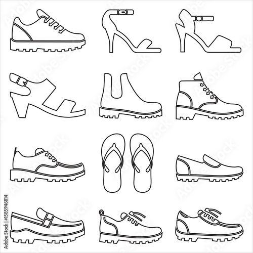 shoe, footwear, boot, sandal, heel, sneaker, loafers, flip-flop, fashion, style, outline, collection, variety, graphic, design, black-and-white, illustration, modern, casual attire, formal, athletic, summer, winter, unisex, man, woman, children, clothing, accessory, clothes rack, selection, ensemble, outfit, shoe, vector, boot, silhouette, high, foot, heel, set, woman, elegance