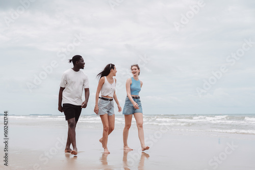 Diverse group of young friends walking on the beach together, smiling and enjoying summer vibes. Multicultural friendship and happy lifestyle on vacation.