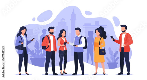 professional, networking, business, people, communication, technology, mobile, device, smartphone, tablet, urban, city, background, diverse, group, team, meeting, collaboration, modern, stylish, illustration, vector, graphic, design, contemporary, lifestyle, connection, interaction