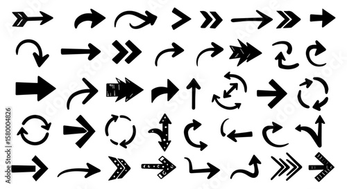 Diverse hand drawn arrow shapes point directions across a white backdrop with artistic style and dynamic movement, ideal for graphic designs.