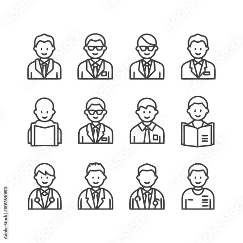 portrait, illustration, people, professional, individual, businessman, doctor, teacher, student, reading, book, goggles, attaching, suit, jacket, uniform, avatar, icon, design, graphic, vector, outline, drawing, vignetting, art, style, minimalist, simple, modern, elegant, clean, professional, diverse, various, different, activity, occupation, career, work, study, learn, cognition, education, male