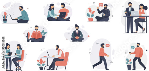 work, office, home, remote, laptop, reading, talking, thinking, sitting, standing, walking, casual attire, formal, business, collaboration, communication, learning, relaxation, sharpened, idea, brainstorming, planning, networking, hot drink, tea, book, plant, modern, flat, illustration, graphic, design, vector, character, man, woman, diversity, group, team, professional, student, creative, tied-up, calm, productive, healthy, lifestyle, digital
