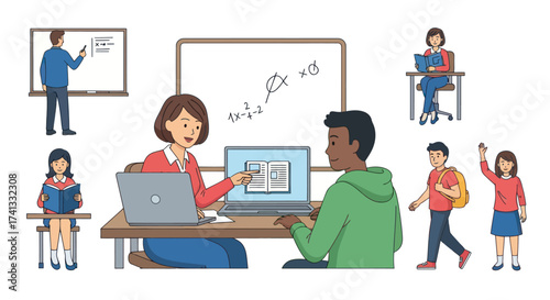 Diverse Students and Teacher in Classroom Learning Environment with Technology.