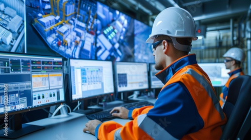 Diverse team analyzing data on multiple computer screens in a modern control room with advanced technology