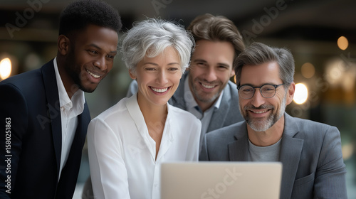 Diverse team collaborating around a laptop in modern office