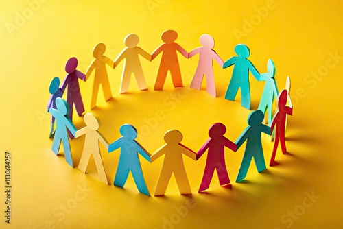diversity, inclusion, banner, paper, cut-out, figure, yellow, background, togetherness, multicultural, multiracial, ethnicity, representation, understanding, solidarity, connection, belonging, empowerment, optimistic, bright, colourful, graphic, illustration, abstract