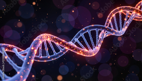 DNA strand with glowing particles on a dark background for educational materials, blogs, presentations, health awareness campaigns, and scientific articles