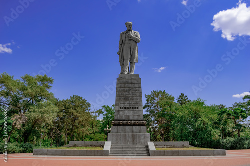 Dnipro, Ukraine - July 21, 2020: Monument to Taras Shevchenko on Monastyrsky Island in Dnipro. Sculpture of the famous Ukrainian poet on a high pedestal in the park on a sunny summer day