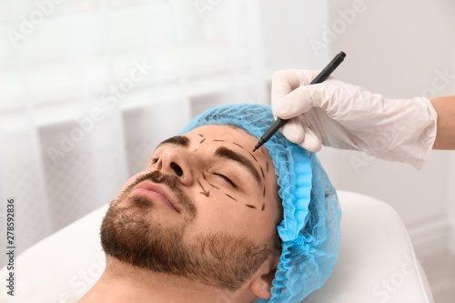 Doctor drawing marks on man's face for cosmetic surgery operation in clinic