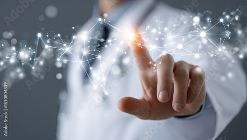 doctor, medicals, technology, network, digital, futuristic, interface, interaction, touch, hand, finger, science, innovation, connectivity, health, future, virtual, overlay, light, glow, white, coat, stethoscope, grey, background, patient, care, advancement, progress, human, connection, datum, information, stream, node, link, system, modern, design, concept, graphic, illustration, medicine, solution, expert