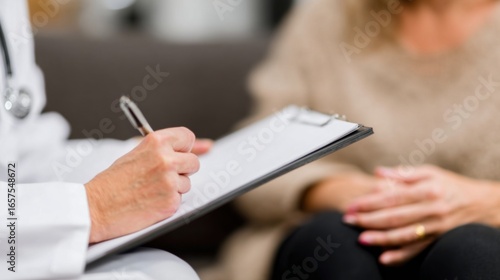 Doctor taking notes on a clipboard during a medical examination, engaging with a patient in a caring and professional manner