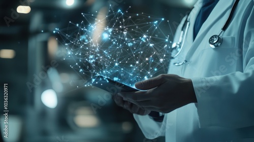 doctor, technology, health care, medicals, digital, network, connection, innovation, science, medicine, datum, information, future, progress, research, analysis, treatment, diagnosis, patient, hospital, clinic, electronic, device, mobile, app, online, cloud, virtual, care, health, well-being, professional, stethoscope, tablet, white, coat, blue, artificial, intelligence, ai, computer, cyberspace, web, platform, smartphone, touch screen, screen
