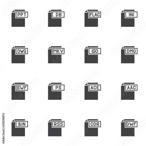 Document File Format vector icons set, File types modern solid symbol collection, filled style pictogram pack. Signs, logo illustration. Set includes icons as flac, iso, dmg, ppt, ini, swf, ace, cdr