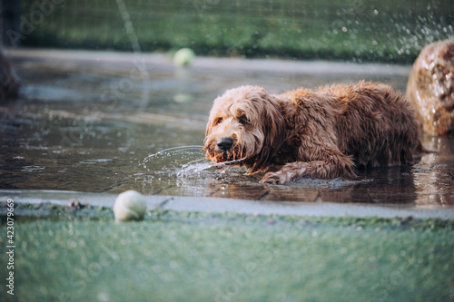Dog drinking water at the dog park.