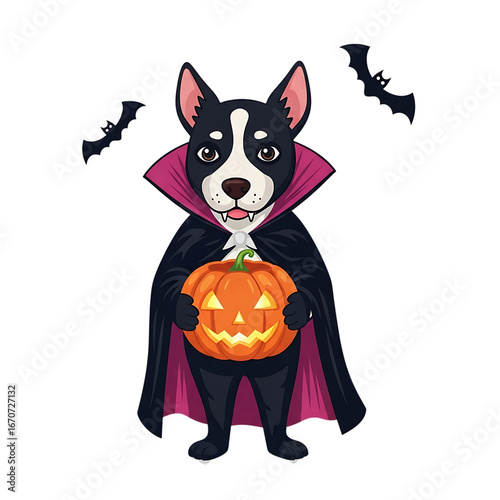Dog dressed as a vampire holding a pumpkin isolated on transparent background