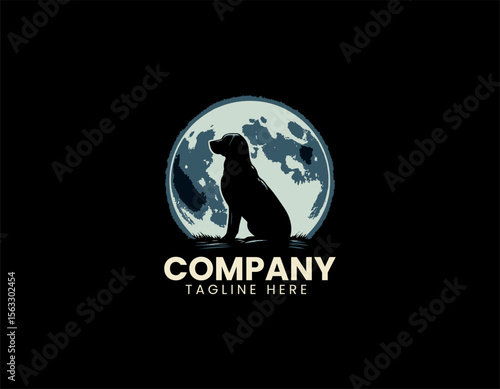 Dog howling under the crescent moon in a bold vector logo with mystical night theme