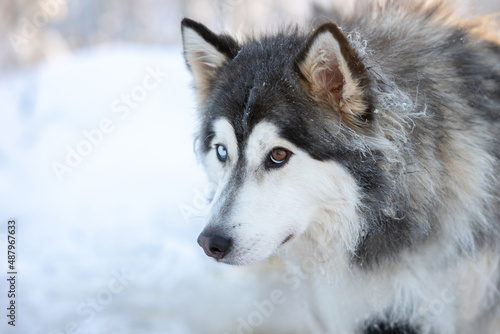 Dog husky breeds in winter on a snowy background.