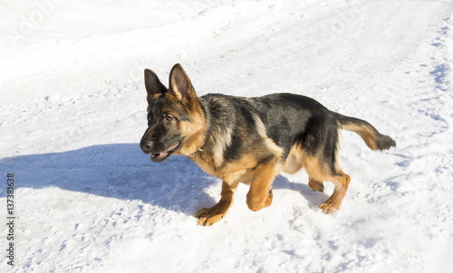 Dog runs in the winter park, selective focus with shallow depth of field.